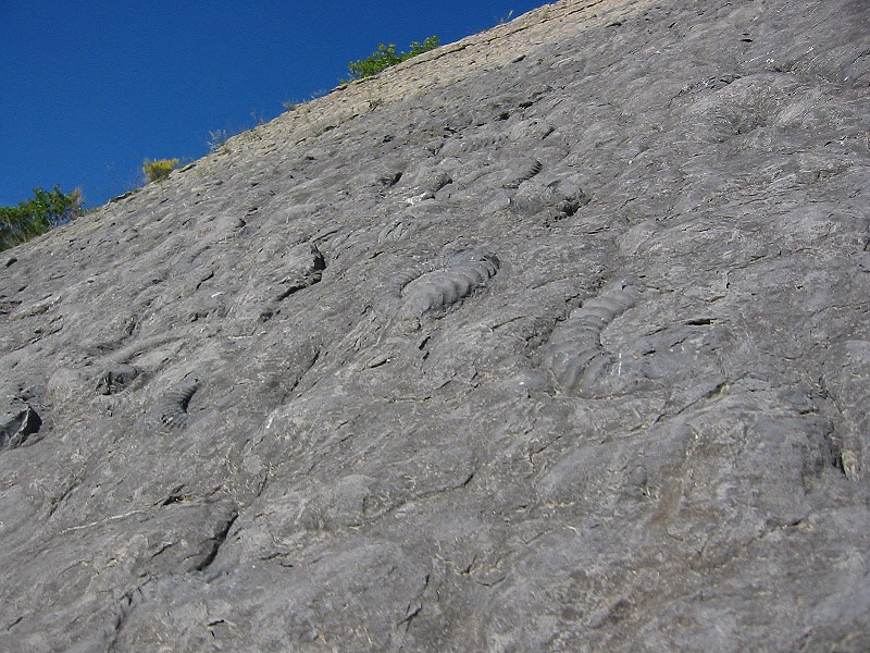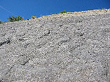 ...to make another long trail short. The ammonites have nothing to do with the Musee Promenade. The trail evetually gets you in the vicinity, but the actual "wall" is at ground level next to the road (CD900a) which leads northeast out of town. So I did find what I was looking for, but messed up my feet unnecessarily in the process. After a few quick pics I quickly walked back to the train station to get on my way... |