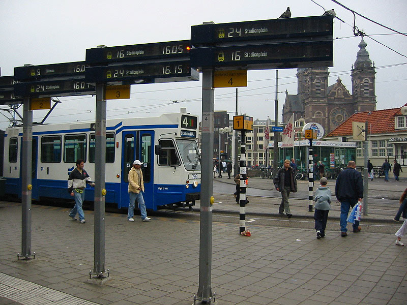 Arriving from the airport via train to Central Station you can either start walking, or there are two tram "loops" out front, where the track and destination are clearly shown. A single trip is 1.30 Euro, but a 5.50 Euro day pass would have been better. You buy the ticket on the tram, coins only, ack! The round trip train ticket from Schipol (the airport) was 5.50 Euro leaving about 6 times an hour. | ![]() |
