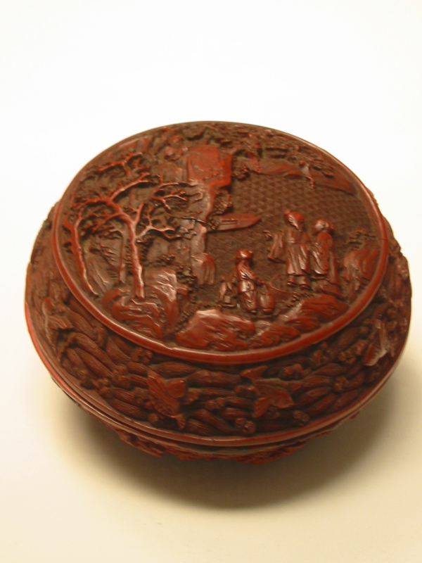 The is a box, probably 4 inches in diameter carved out of lacquer (tree resin). I think the picture is a little blurry. | ![]() |