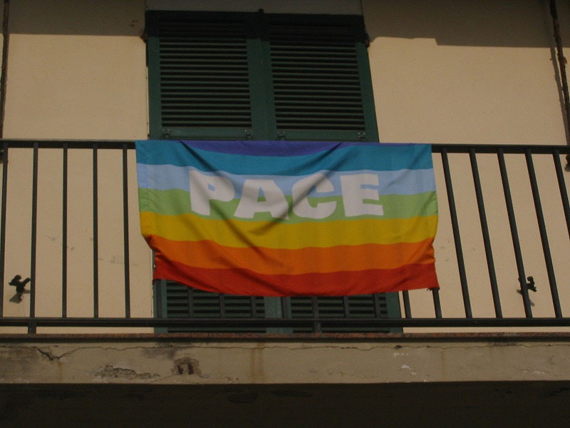 Side step... I saw these all over the place, usually hanging from balconies. This is the symbol of Italian opposition to the war with Iraq. "A banner from every balcony" was something I saw... to be fair I also saw a few "We are in this together" stickers with the US flag, and a few "God bless America". As has been the case since I arrived I never had the impression that anyone cared that I was an American one way or another. |