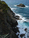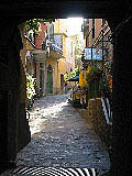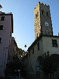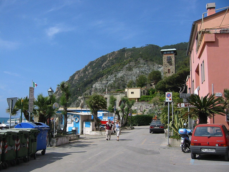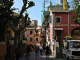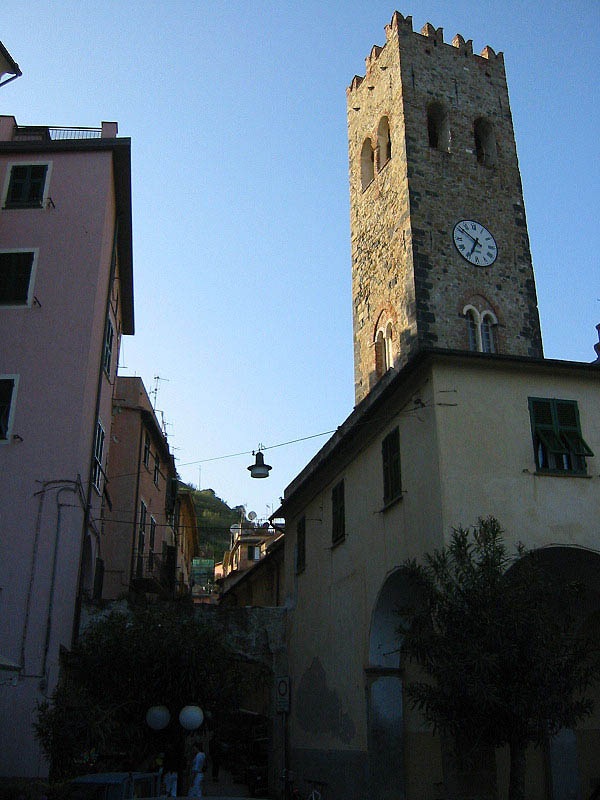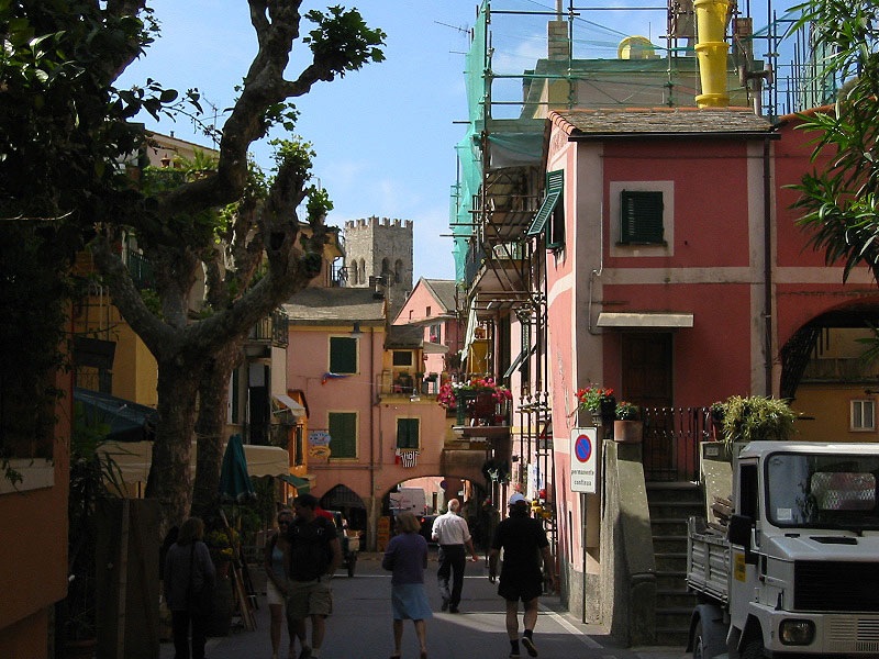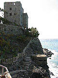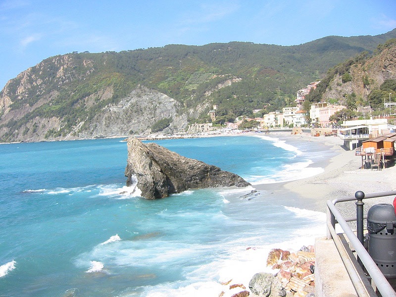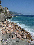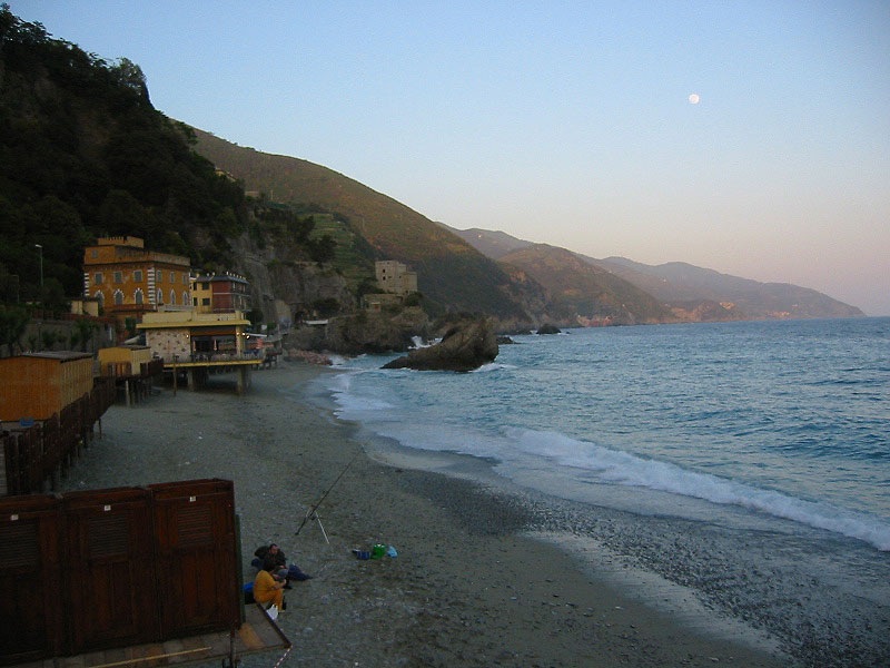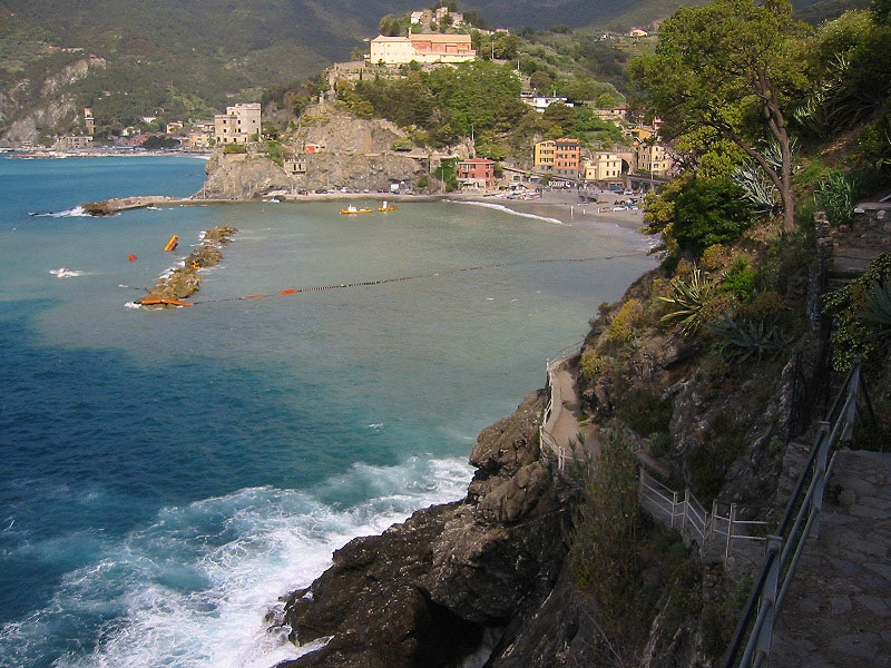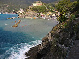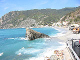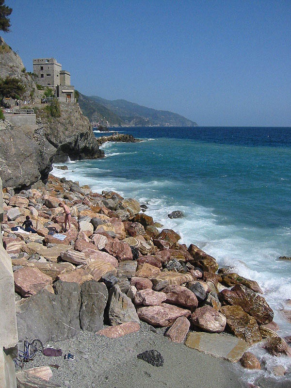 The first beach at Monterosso. Normally this might have more activity, but if you look on the left hand side of the picture, just beyond the break, you can see a couple parts of the dredging barge that sank that morning. This is part of the reason for all the churned up junk in the water and it was all of the reason for the lingering smell of gasoline in the air. Pretty much ruined their day. |