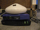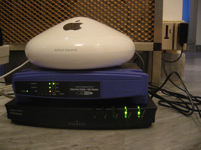 Ok, before I get started, this is the "home" network in Nice. DSL from the phone jack on the right, to dsl modem, to dsl router, to Apple Airport Extreme base station. I can use the laptop anywhere in the apartement and the camera goes into the router. I know, geek stuff. | ![]() |