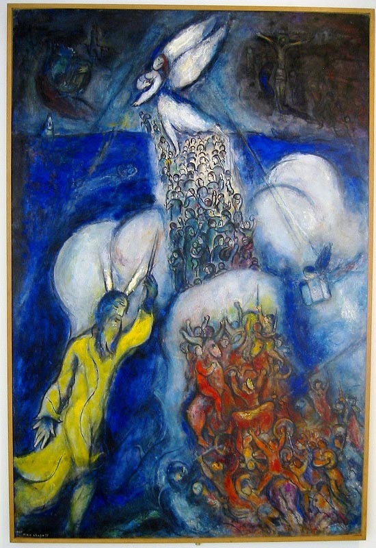 Exodus... crossing the Red Sea. The bad guys (red Egyptians) are about to get it. Chagall painted two streams of light coming out of many characters heads. Some kind of halo, but they kind of look like horns. | ![]() |