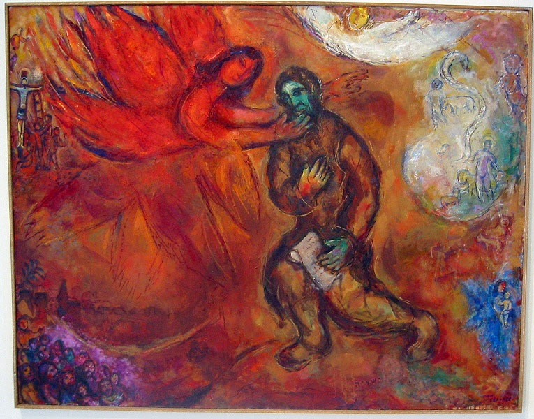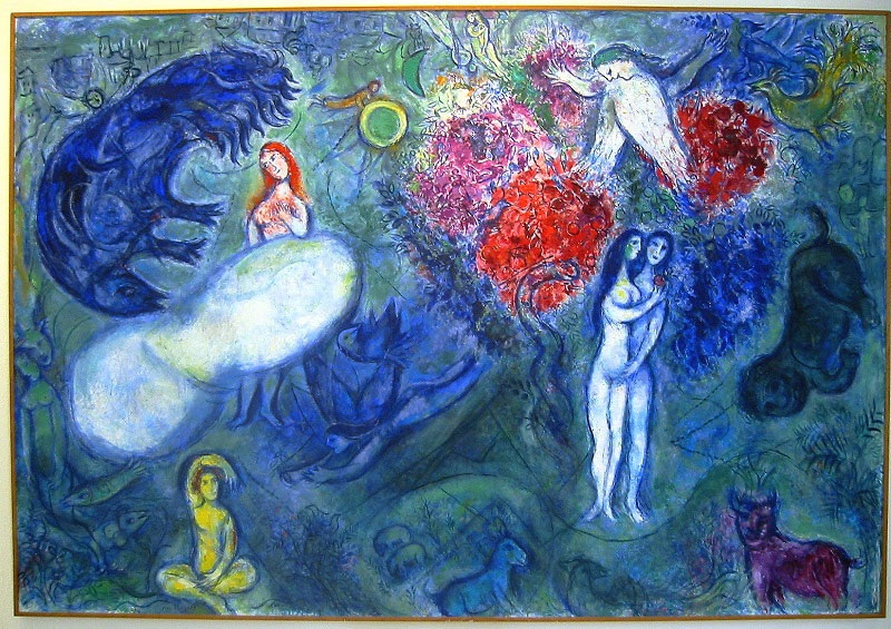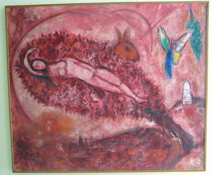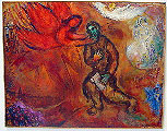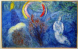 The Creation of Man: (sorry I am not giving you the French titles) My quick interpretation is that here is this angel holding "man" and to the upper right is "the future", all the things man is going to do. One theme I have not researched is that Chagall was "of the Tribe" (thanks Eric) but he painted Jesus on the Cross in many of these paintings... even though they are supposed to represent Old Testement stories... may have to look into that one | ![]() |