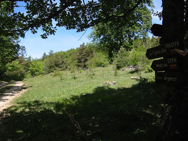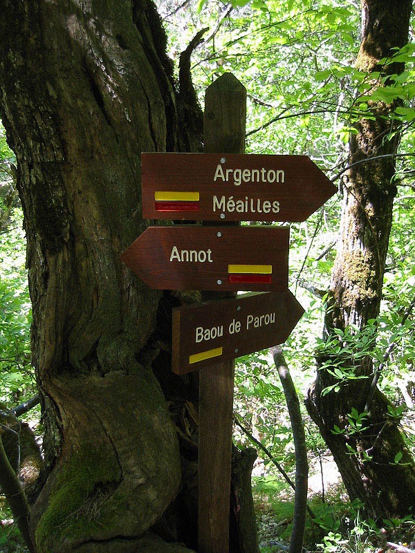 Near the top the map shows a group of trails converging... I basically go "left" with a group that will start bringing me down to Meailles. See the sign on the right pointing the way... it is the last sign I will see for my trail...