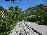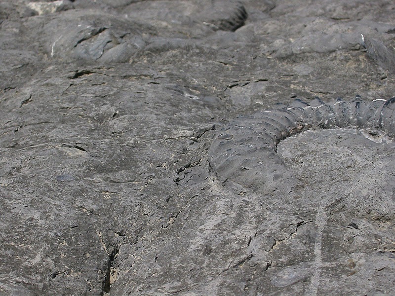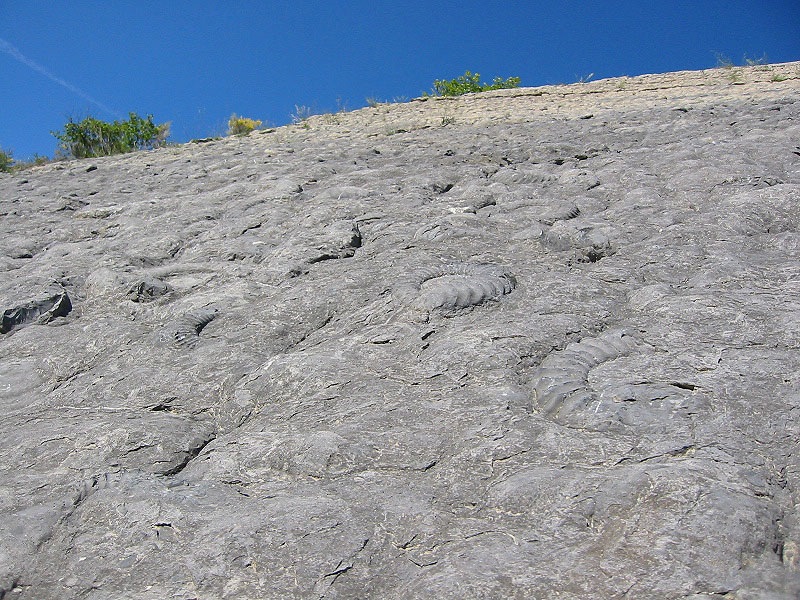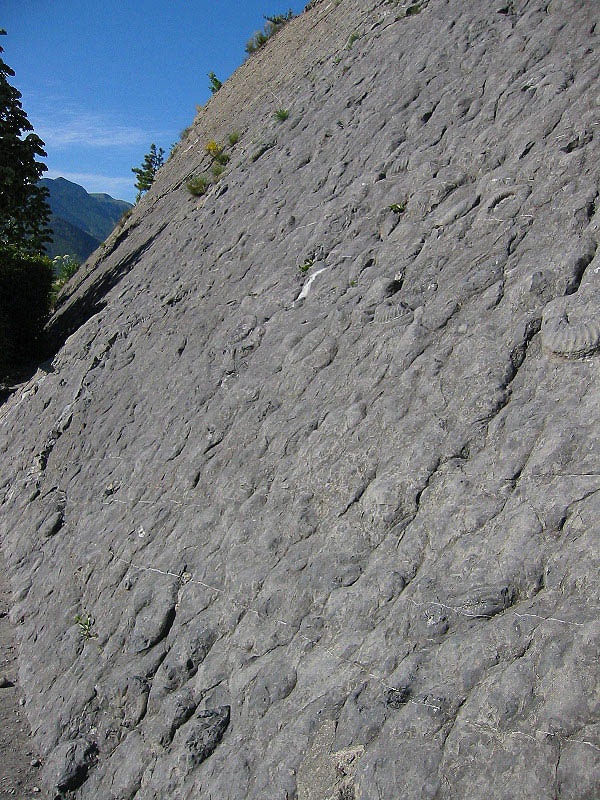 ...to make another long trail short. The ammonites have nothing to do with the Musee Promenade. The trail evetually gets you in the vicinity, but the actual "wall" is at ground level next to the road (CD900a) which leads northeast out of town. So I did find what I was looking for, but messed up my feet unnecessarily in the process. After a few quick pics I quickly walked back to the train station to get on my way... |