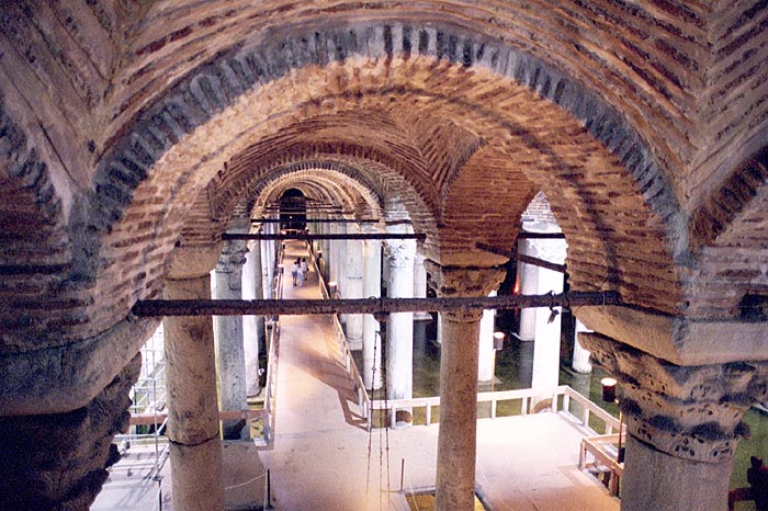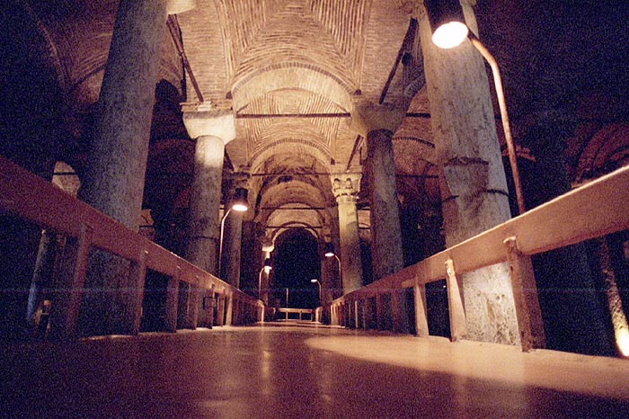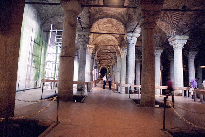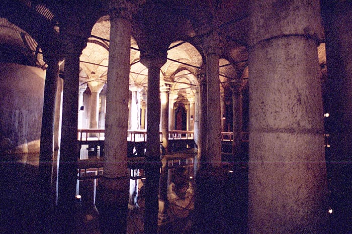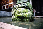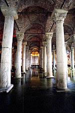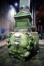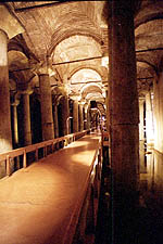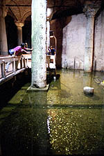 Smack in the middle of the Sultanahmet are the remains of a large Roman cistern. It was built in 532 by Justian to supply water to the Great Palace. The entrance is located right next to the Hagia Sohpia in what looks like a subway entrance. The cistern now has walkways looping though the 336 columns. They have colored lights an music playing, which didn't really do much for me. There is a small cafe in the cistern as well. It's really all quite unique. |