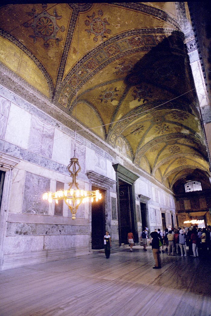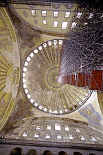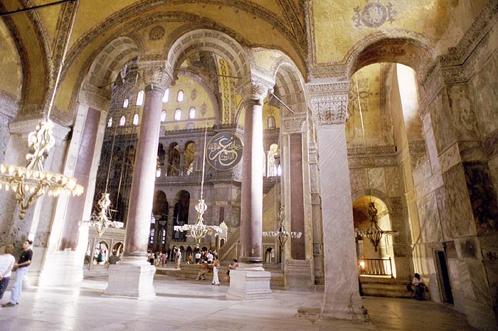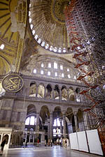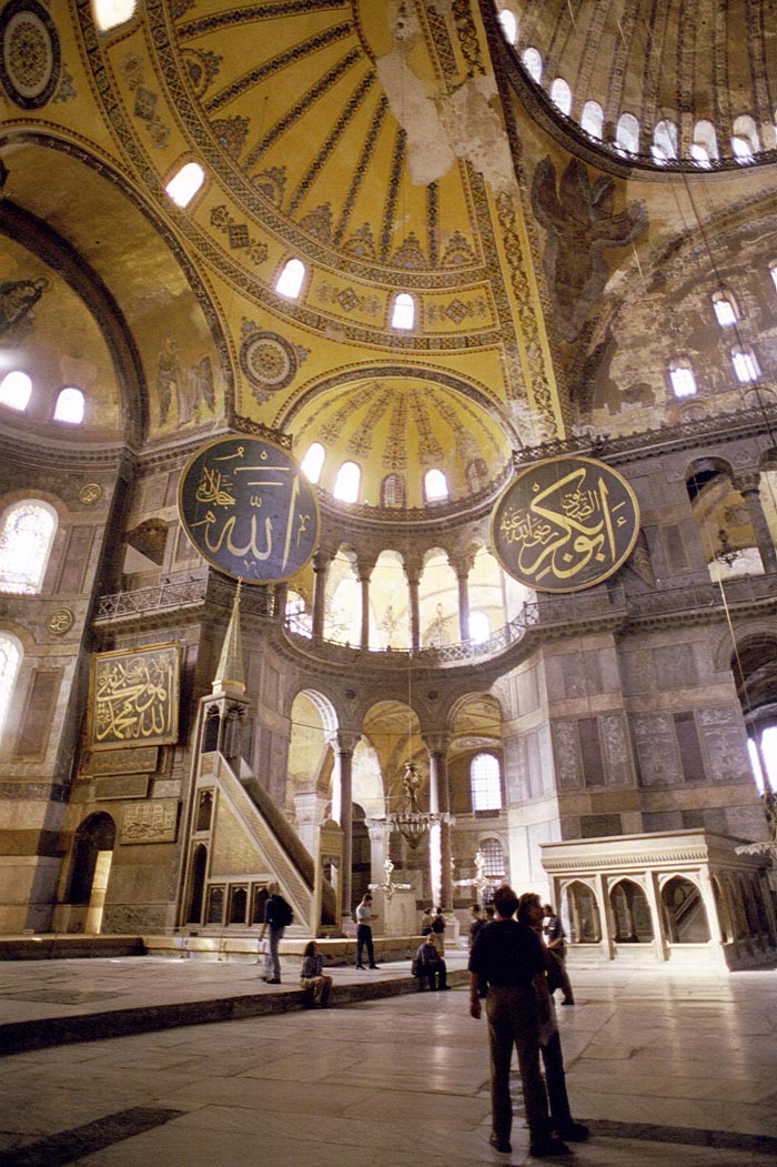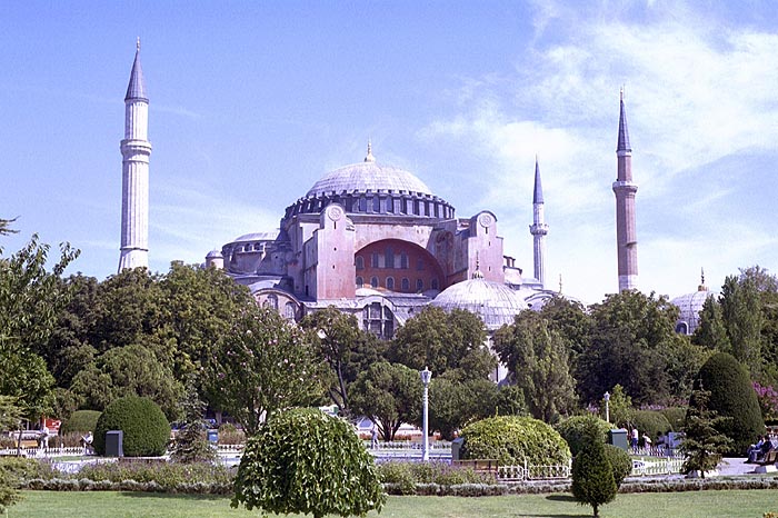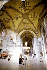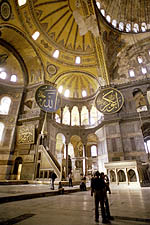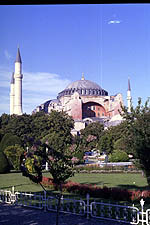 Hagia Sophia means "Church of the Holy Wisdom". There are many churches with this name, but this is the largest and most spectacular. Opened by Justinian in 537 the church was designed to mirror heaven. Apparently it had that effect on some people. The pagan queen of Russia was so impressed with a high mass held in the church that she returned to her country and converted it to Orthadox Christianity. Someone pointed out that if it is impressive to us, then remember that the vast majority of people in 500AD were living in mud huts. |