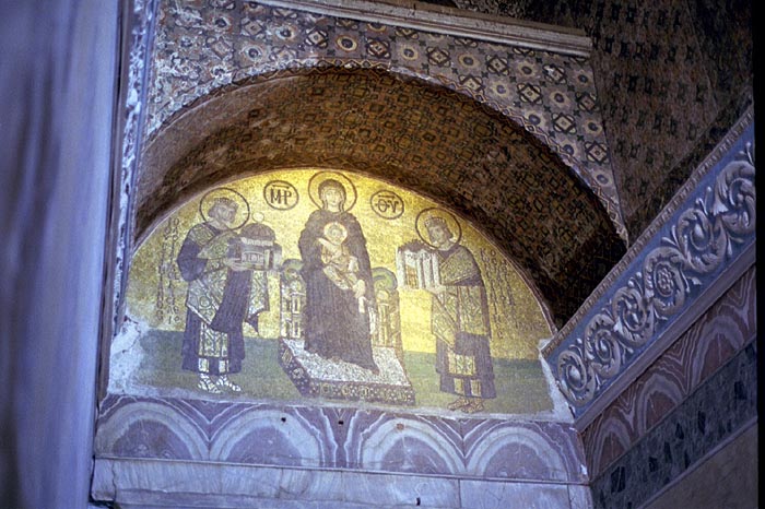 This mosaic shows Justinian on the left presenting the Hagia Sophia to a seated Mary and Jesus. On the right is Constintine doing the same with the city of Constantinople (Istanbul). |